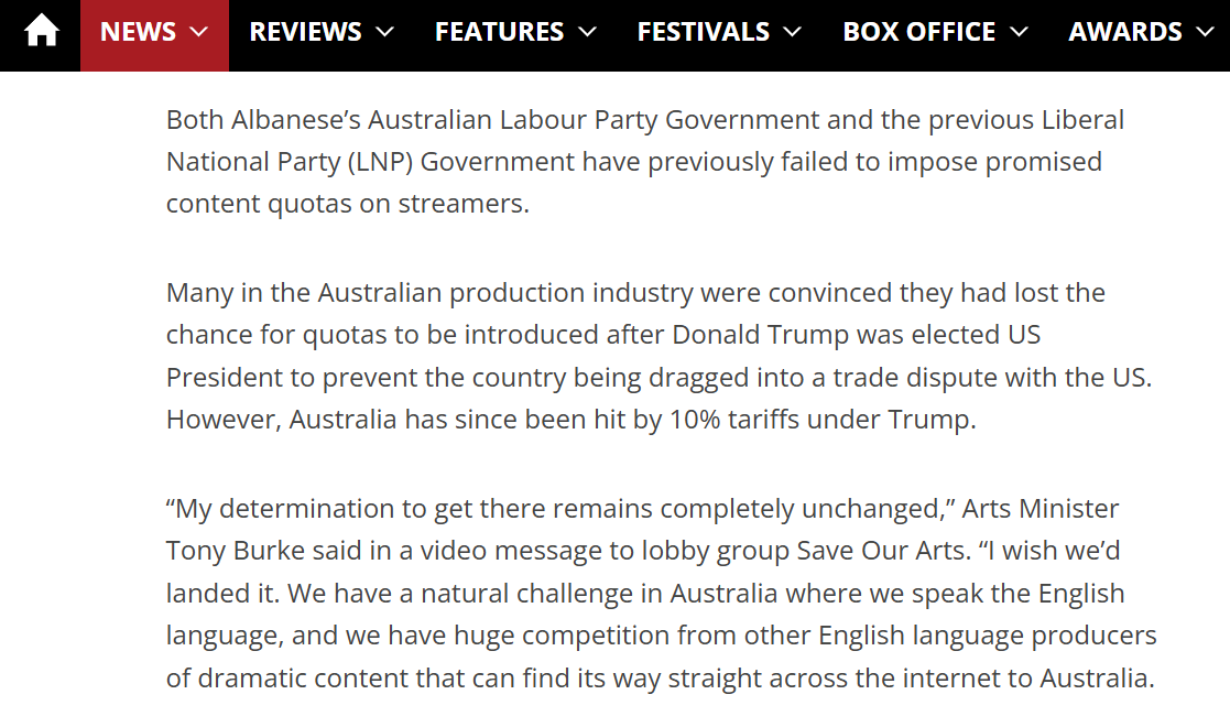 Screen Daily outlines Arts Minister, Tony Burke’s letter to Save Our arts, re-committing to local content quotas. Link